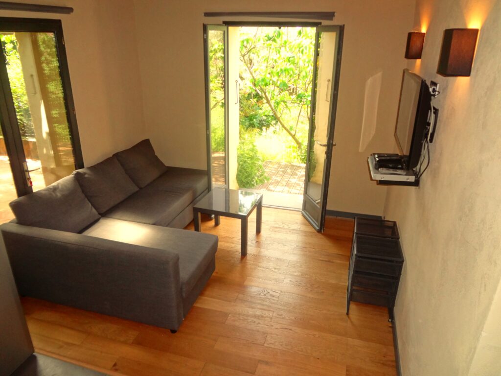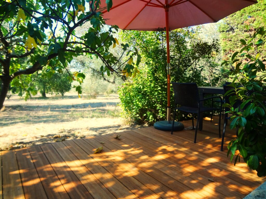 An der hölzernen Terrasse der Ferienwohnung Roussette wächst ein herrlicher Feigenbaum, von dem Sie nach belieben naschen können. Über die Terrasse mit Blick in den Garten betreten Sie Ihre Ferienwohnung. Dort finden Sie im Erdgeschoss ein Schlafzimmer mit King-Size-Bed sowie ein weiteres mit zwei Einzelbetten. Das Badezimmer ist mit einer ebenerdigen Dusche und einem WC ausgestattet. Selbstversorger profitieren von der voll ausgestatteten Küche. Im Wohnbereich finden Sie auch eine gemütliche Couch, von der aus Sie in den Garten schauen können. Natürlich gibt es hier auch ein Fernsehgerät. Sie haben darüber hinaus während Ihres Urlaubes kostenfreien WLAN Zugang. Die Terrasse vor der Ferienwohnung ist ein herrlicher Ort zum gemeinsamen Speisen, für den Kaffee am Morgen oder einfach, um ein gutes Buch unter südfranzösischer Sonne zu lesen. Der großzügige Swimming Pool mit Warmwasserdusche ist in den Garten integriert, voll umzäunt und daher kindersicher. Auf der ihn umgebenden hellen Natursteinterrasse finden Sie Sonnenliegen, die im Schatten der Olivenbäume zum Entspannen einladen. Im Garten gibt es auch ein Boule-Feld auf dem Sie sich mit Freunden oder Familie zu einem Spiel zusammen finden können. Nutzen Sie auf Anfrage auch gern den Elektro-Grill. Auf dem Gelände gibt es einen kostenfreien Parkplatz.