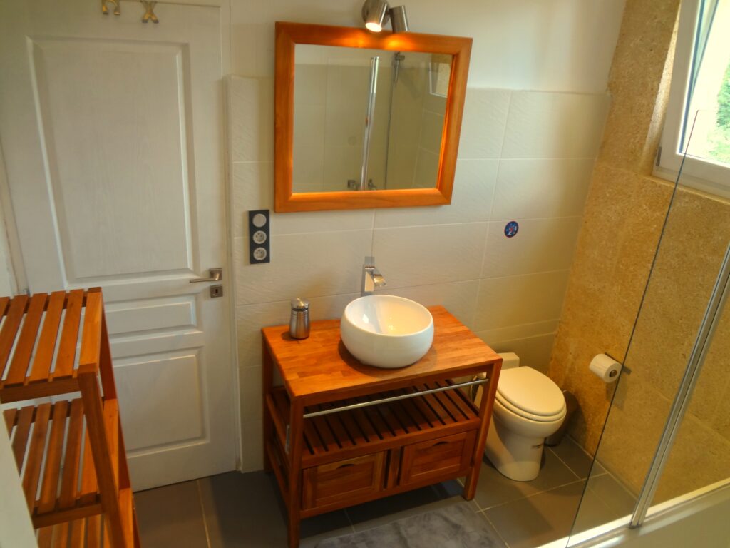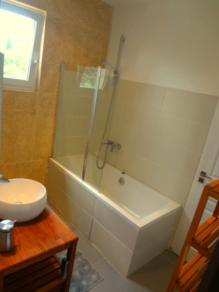 - im erstem Stock das Bad mit Dusche und Badewanne, Waschbecken, Handtuch- Wärmer, Fön und WC.